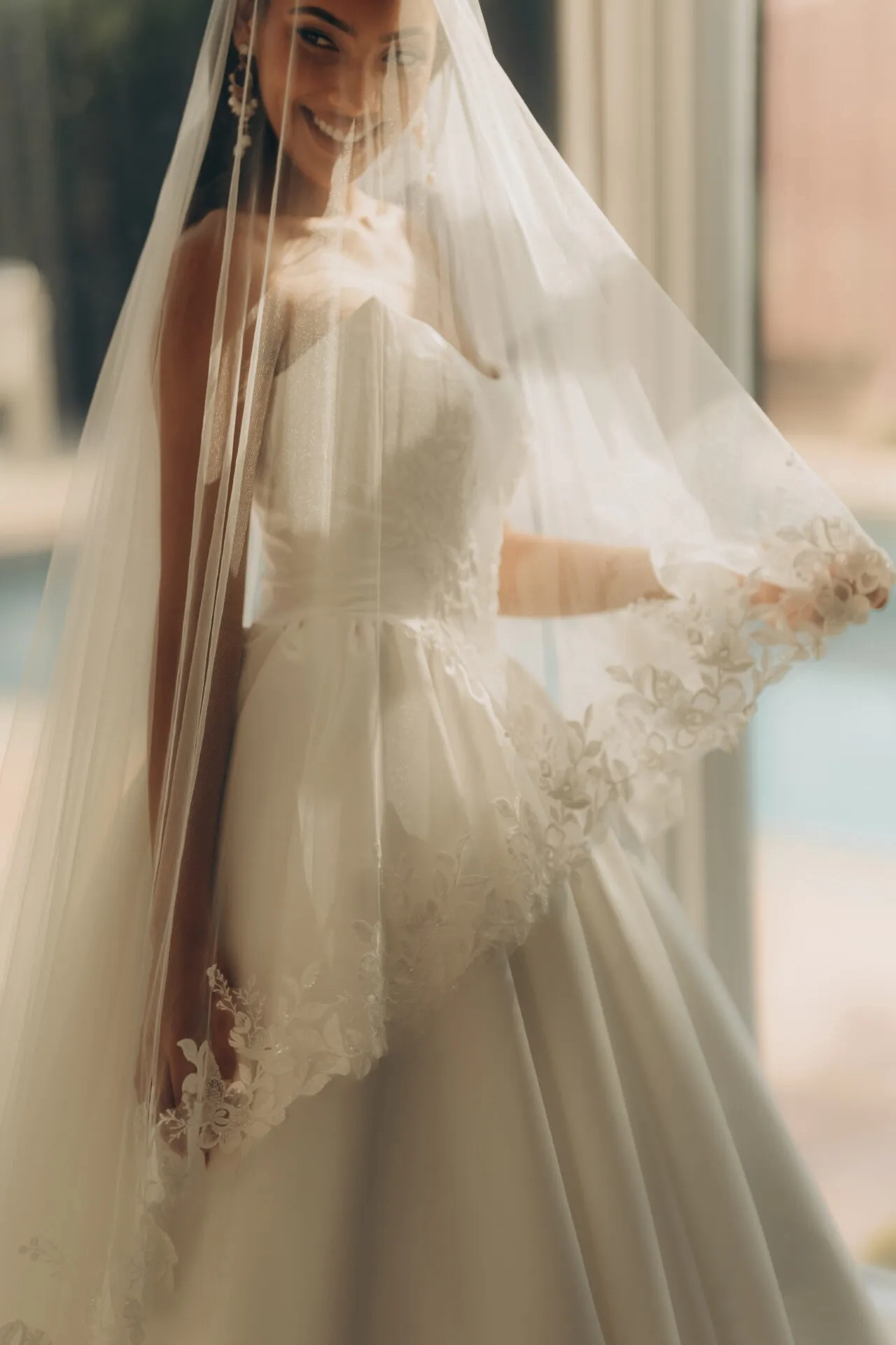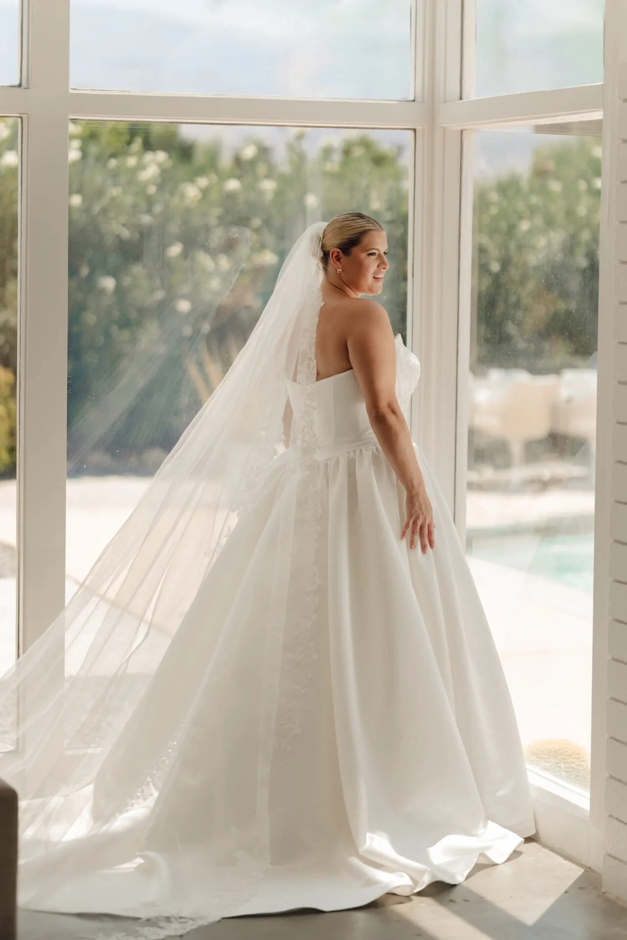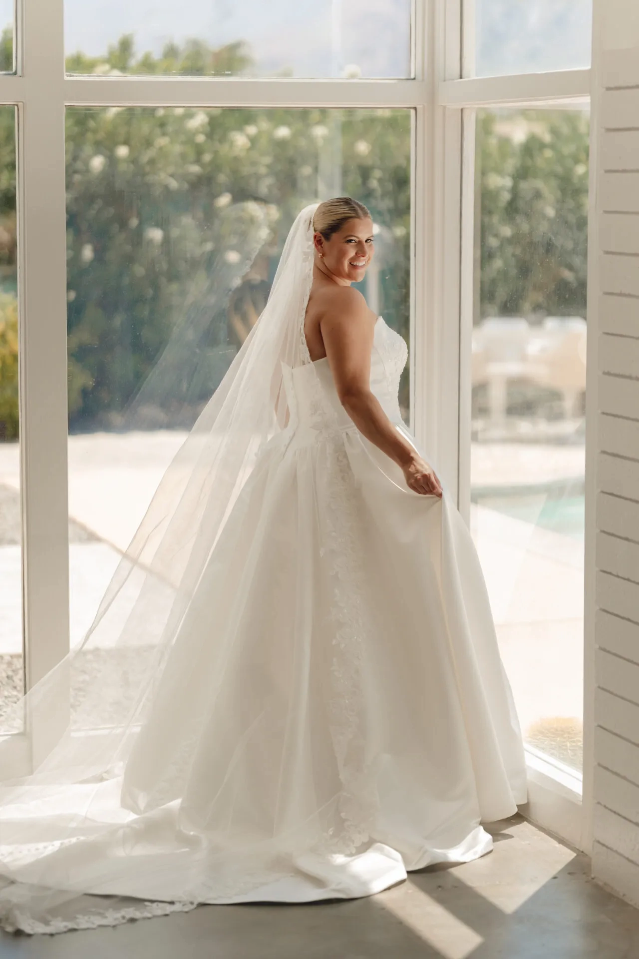 Model wearing a bridal whate dress